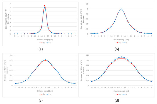 Dose rates of 192Ir (mHDR−V2) and 60Co (Co0.A86) (normalized at y = 1 cm). (a) y = 0.25 cm; (b) y = 1 cm; (c) y = 2 cm; (d) y = 3 cm. The 60Co source produced higher dose rates at a distance from the source of less than 1 cm, while the 192Ir source produced higher dose rates at a distance from the source of more than 1 cm.