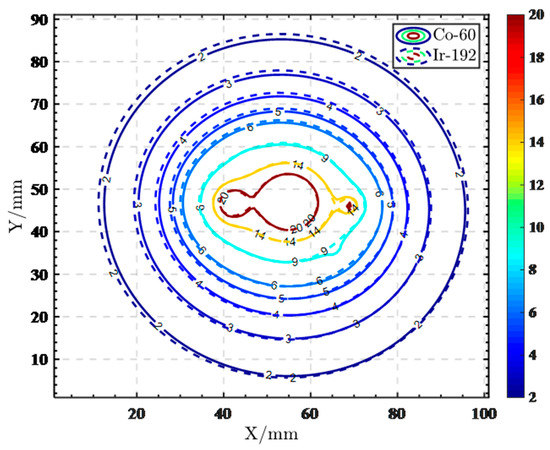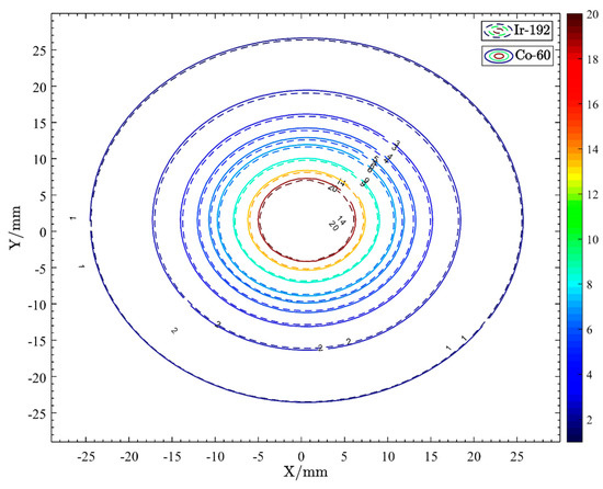 We normalized the recommended dose rate parameters for both sources at the dose reference point (1 cm) and reduced them to the coordinate system (Figure 2). The figures produced show that 60Co and 192Ir have similar dose distribution trends with 60Co producing higher dose rates at a distance from the source of less than 1 cm and 192Ir producing higher dose rates at a distance from the source of more than 1 cm. This indicates that the dose gradient of 60Co is greater than that of 192Ir, as also confirmed by Safigholi et al. [24]. The 60Co source has a faster dose rate decrease and may provide better protection to surrounding OARs. For the majority of points more than 10 mm away from the source center, even if the source step is changed, Farhood et al. concluded that the dose distributions of both sources are stable and, therefore, can be substituted for each other [25]. Dayyani et al. found slightly larger hot spots within the clinical target volume (CTV) when using the 60Co source, possibly due to the steeper dose gradient of 60Co. The dose values for 60Co were higher than those of 192Ir in this area but lower outside when the same dose was delivered to the CTV perimeter (4 cm from the source) [26]. This matched the features of the dataset. Meanwhile, we used the Oncentra treatment planning system (TPS) to place a single source in the plans of 192Ir and 60Co, respectively, and normalized the isodose line at the dose reference point (θ = 90°, y = 1 cm). As shown in Figure 3, within a distance of less than 25 mm from the source, it is apparent that there is little difference in the dose distribution of the two sources.