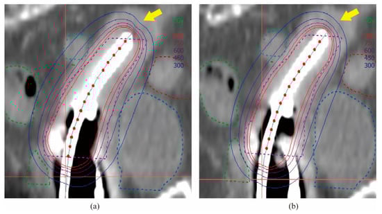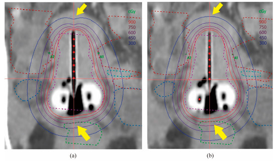 (2D HDR BT) Distribution of isodose lines in the transseptal canal’s coronal plane. (a) 192Ir; (b) 60Co. As indicated by the arrows, 60Co was more prominently distributed in the cephalocaudal direction and provided a higher dose in the rectum.