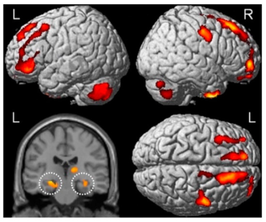 SPM analyses identified hyperactivity (warm colours) during accurate delayed verbal memory recognition in Ch+ breast cancer survivors compared to healthy control. Adapted from Kesler et al. [111].