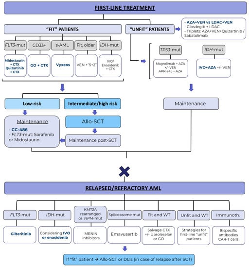 The prognosis of relapsed and refractory AML (R/R AML) remains poor (median OS around 7 months), with no satisfactory or standard salvage treatment [52]. The knowledge of the molecular pathophysiology of AML has allowed us to identify novel driver mutations that have become objectives for new promising therapeutic alternatives [53]. Due to clonal evolution, it is advisable to repeat mutational profiling at the time of relapse in order to select the best-targeted therapy [1].