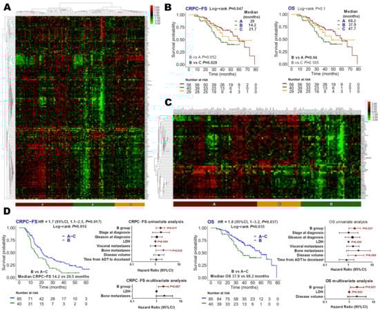 Global gene expression analysis. (A) Hierarchical clustering expression heatmap for expression values of the global genes panel, excluding TMPRSS2-ERG-specific and imbalance probes; (B) Kaplan–Meier curves representing CRPC-free survival (CRPC-FS) and overall survival (OS) according to groups defined from the global genes panel; (C) hierarchical clustering expression heatmap for expression values of differentially expressed genes in group B vs. groups A–C (|FC| ≥ 1.5 and FDR < 0.05); (D) Kaplan–Meier curves representing CRPC-FS and OS according to group B and groups A–C and forest plots representing the univariate and multivariate analysis. LDH: lactate dehydrogenase; HR: hazard ratio; CI, confidence interval.