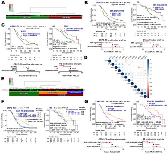 Estrogen receptor (ESR) signature. (A) Hierarchical clustering expression heatmap for expression values of the ESR signature; (B) Kaplan–Meier curves representing CRPC-free survival (CRPC-FS) and overall survival (OS) according to ESR signature and forest plots representing the multivariate analysis; (C) Kaplan–Meier curves representing CRPC-FS and OS according to ESR2 expression segregated into tertiles and forest plots representing the multivariate analysis; (D) correlation matrix of ESR, AR, neuroendocrine (AURKA, CHGA, SYP, MYCN, and EZH2) and tumor suppressor (TP53, RB1 and PTEN) genes. Correlation coefficients (r) between expression values are represented when p < 0.05; (E) hierarchical clustering expression heatmap for expression values of the ESR and AR genes; (F) Kaplan–Meier curves representing CRPC-FS and OS according to ESR and AR genes; (G) Kaplan–Meier curves representing CRPC-FS and OS according to ESR-High+AR-low and the other groups and forest plots representing the multivariate analysis. LDH: lactate dehydrogenase; HR: hazard ratio; CI, confidence interval.