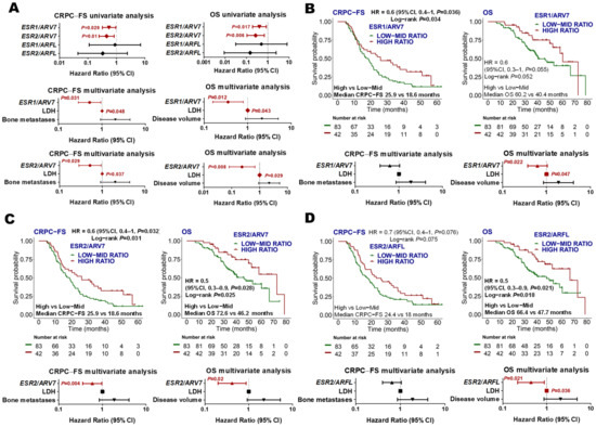 ESR/AR expression ratios. (A) Forest plots representing the univariate and multivariate analysis of the ratios between ESR and AR genes as continuous variables for CRPC-FS and OS. Those ratios with p < 0.1 in the univariate were included in the multivariate analysis; (B-D) Kaplan–Meier curves representing CRPC-FS and OS according to ESR1/ARV7 (B), ESR2/ARV7 (C), and ESR2/ARFL (D) ratios segregated into tertiles and forest plots representing the multivariate analysis. LDH: lactate dehydrogenase; HR: hazard ratio; CI, confidence interval.