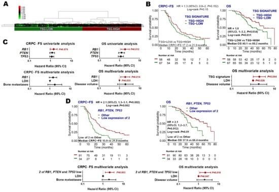 TSG-low expression was independently associated with shorter OS (HR 2, 95% CI 1–3.8; p = 0.044) (Figure 5B). Considering TSG individual genes as continuous variables in a multivariate analysis, low expression of RB1 was independently associated with shorter OS (HR 1.9, 95% CI 1.1–3.2, p = 0.014) (Figure 5C). Moreover, the lower tertile expression of 2 out of the 3 TSG independently correlated with shorter CRPC-FS (HR 2.1, 95% CI 1.3–3.5, p = 0.003) and OS (HR 2.2, 95% CI 1.1–4.1, p = 0.018) (Figure 5D).