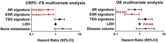 Next, we assessed the significance of AR, ESR, and GST signatures together. The multivariate analysis including significant molecular signatures and clinical factors showed that high expression of AR (HR 0.5, 95% CI 0.3–0.8, p = 0.004) and ESR (HR 0.5, 95% CI 0.3–0.9, p = 0.011) signatures correlated with longer CRPC-FS, and high expression of ESR signature (HR 0.5, 95% CI 0.2–0.9, p = 0.033) correlated with longer OS (Figure 6).
