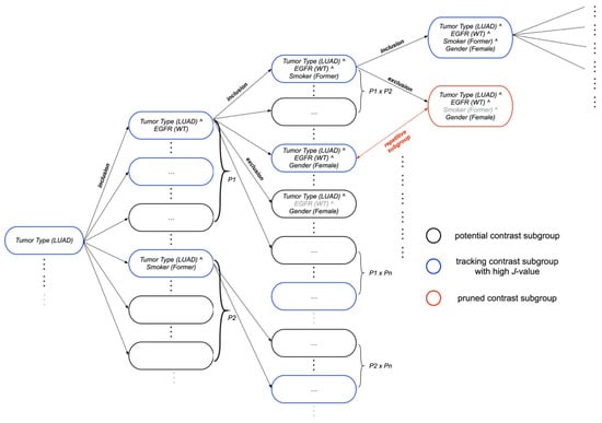 By iterating over various paths in the search space, the Floating Subgroup Selection traverses multiple paths. A phenotypic variable with the highest contrast score against the outer population (e.g., Tumor Type = LUAD in Figure 1) forms a base subgroup via the Path Expansion process. In the first inclusion step, it adds a new variable, e.g., EGFR = WT, to the base subgroup (Tumor Type = LUAD AND EGFR = WT). To eliminate less significant inclusion steps, the exclusion function is used after each inclusion step. For example, when in the third inclusion step, the subgroup is (Tumor Type = LUAD AND EGFR = WT AND Smoker = Former AND Gender = Female), the exclusion function eliminates the less significant move (Smoker = Former) from the existing subgroup if the newly created subgroup (Tumor Type = LUAD AND EGFR = WT AND Gender = Female) has a higher contrast score. When the algorithm reaches the subgroup with the highest contrast score, the exploratory search is terminated.