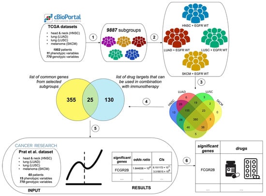 Informatic pipeline. ① We ran the Subgroup Discovery algorithm on the combined TCGA dataset. The algorithm output 9887 subgroups. ② We retained EGFR WT subgroups that covered at least 20% of the initial dataset. ③ For these subgroups, we determined common DE genes (n = 380). ④ We then mapped these 380 genes to the list of 155 drug targets. Thus, we identified 25 targets that could be used in immuno-targeted combination therapies. ⑤ We determined significant drug targets that increased the likelihood of SD versus PD using the proportional odds model. ⑥ We matched significant genes to drugs that could be used in immuno-targeted combination therapies using the Drug Gene Interaction Database (DGIdb).