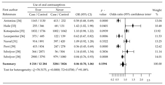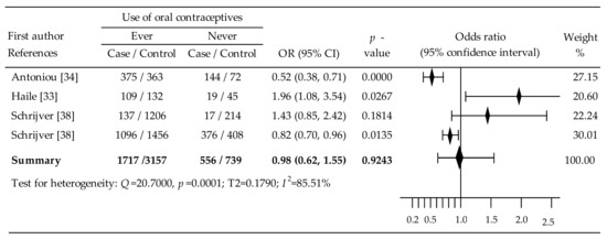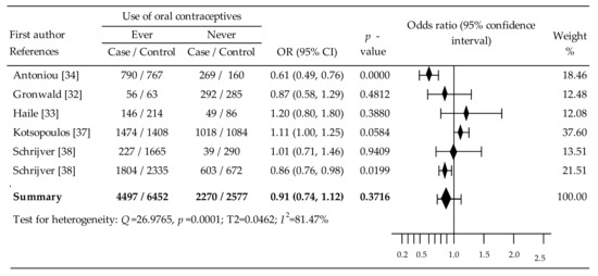The meta-analysis of summary statistics from individual studies was carried out using the STATISTICA 13.3 program (StatSoft Polska, Kraków, Poland) by way of employing the Medical Package program. Based on the data obtained from each study, we calculated the odds ratio (OR) and the 95% confidence interval, a cross-classification of OC users and breast cancer type. A meta-analysis was carried out combining OR from various studies using the DerSimonian–Laird random effects model [26]. In addition, a pre-planned subgroup analysis was performed by the age of first contraceptive use (<20 years vs. ≥20 years), duration of contraception (≥5 years compared to <5 years), and years from the last use of the contraceptive prior to diagnosis (<10 years in compared to ≥10 years). We used I2 and Cochrane Q to evaluate heterogeneity, by the following criteria: high heterogeneity, I2 >75%; moderate heterogeneity, I2 = 50% to 75%; and low heterogeneity, I2 < 50% [27].