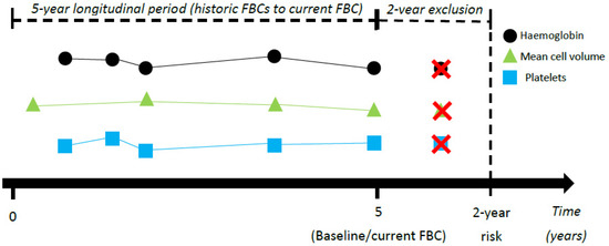 We performed a prospective cohort study (see Figure 1). Baseline was defined as the date of the most recent FBC available. FBCs performed before baseline were considered historic. Trends were identified using historical FBCs over a five-year period up to baseline FBC. Risk predictions are therefore made from the baseline time-point, incorporating information from historical FBCs. A five-year longitudinal period was chosen based on our previous work showing differences in trends between patients with and without a diagnosis confined to five years pre-diagnosis [8].