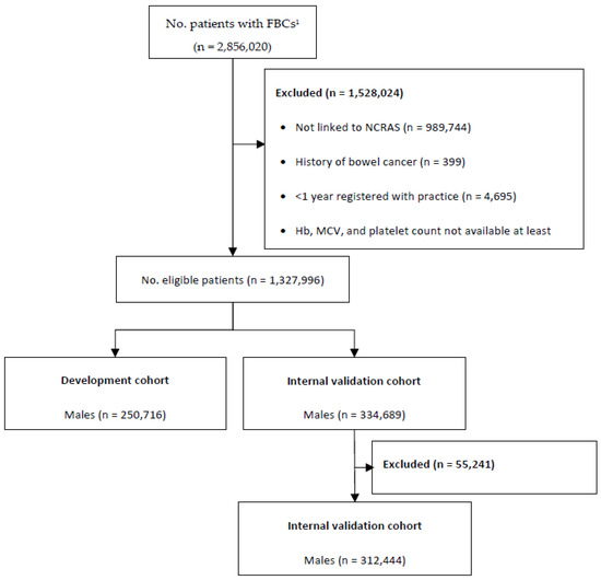 Patient flow diagram. 1 Number of patients available in the CPRD data extract. Abbreviations: FBC = full blood count; NCRAS = National Cancer Registration and Analysis Service; Hb = haemoglobin; MCV = mean corpuscular volume.