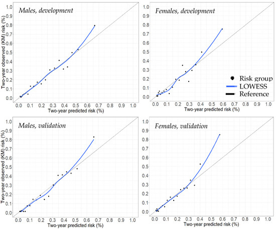 The calibration slope was 1.06 for males and 1.05 for females in the validation cohort, suggesting the presence of little under-prediction. Calibration plots also indicate good calibration (Figure 3), with predicted and observed two-year risk matching closely, hovering over the reference (y = x) line for perfect calibration. The curves diverge slightly from the reference line for the 20th risk percentile group, suggesting a slight under-prediction in the highest risk group.