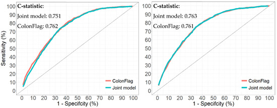 ROC curves and c-statistics (or AUC) for the joint models and ColonFlag are in Figure 4. ROC curves were superimposed for the two models, indicating similar diagnostic ability for two-year risk. Additionally, the c-statistic was comparable in males (joint model 0.751, ColonFlag 0.762) and females (joint model 0.763, ColonFlag 0.761), indicating similar discriminative ability between the two models. In all subgroups assessed, the c-statistic was similar between the joint models and ColonFlag model, although slightly higher for the ColonFlag for most age groups in males.