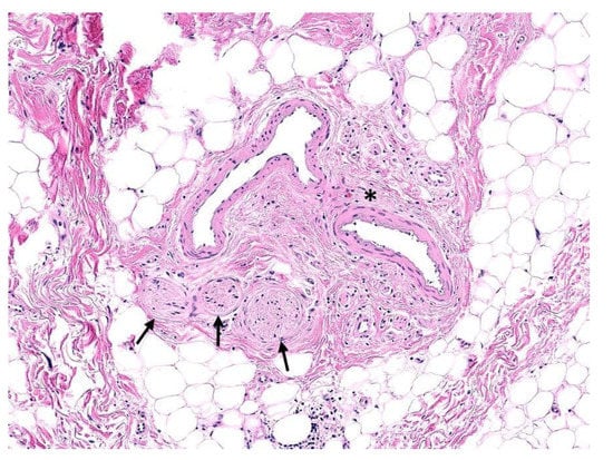 Neurovascular bundle. Several nerve fibers of varying sizes, each surrounded by a thin layer of perineurium (arrows) in association with blood vessels ensheathed in epineurium (asterisk) within fibroadipose tissue (hematoxylin and eosin, 200×).