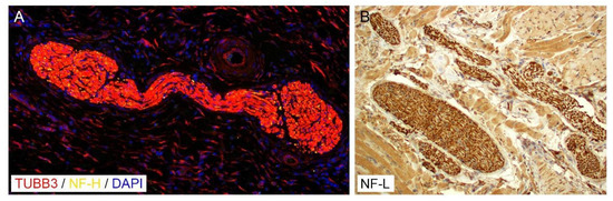 Expression of (A). Beta III tubulin (TUBB3) and neurofilament-heavy (NF-H) in a subcutaneous nerve, counterstained with DAPI (immunofluorescence, 400×); (B). Neurofilament-light (NF-L) in nerve fibers within tongue musculature, counterstained with hematoxylin (immunohistochemistry, 200×).