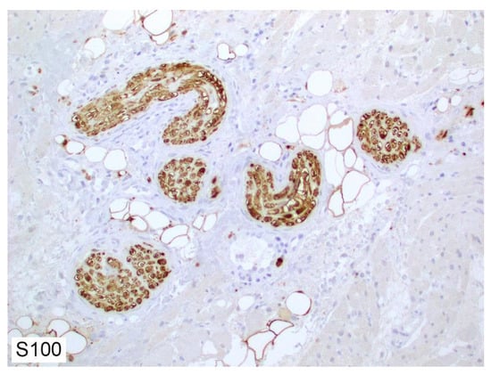In myelinated nerve fibers, a single Schwann cell concentrically encircles repeating segments of the neuronal axon. Each Schwann cell produces a myelin sheath encapsulating a single segment of neuronal axon [7,11]. Unmyelinated gaps on the axon, known as Nodes of Ranvier, are essential for saltatory (discontinuous) and very rapid conduction of depolarization through the nerve fiber [12,13]. In nonmyelinated nerves, a single Schwann cell may encircle several axons. Because Schwann cells are the most numerous nucleated cells in a peripheral nerve, their presence has been frequently used for the identification of nerves in histologic sections. Schwann cells are often positive for S100 (nuclear and cytoplasmic pattern) (Figure 3), GFAP, SOX10, E-cadherin, CD56, CD57, PGP9.5, and calretinin [14,15].