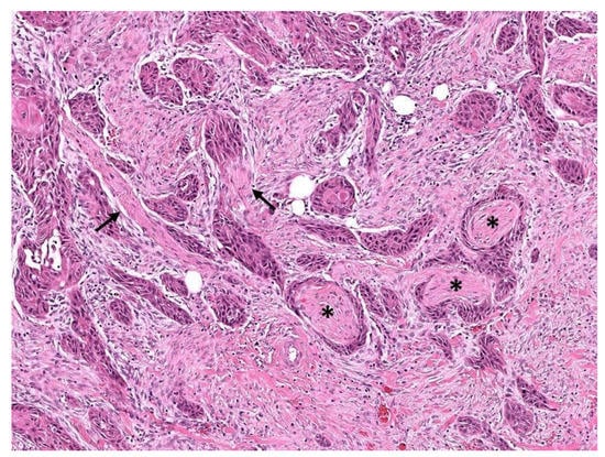 Multifocal perineurial invasion, involving small (arrows, 0.03 mm) and medium (asterisks, 0.12 mm) caliber nerve fibers in cutaneous squamous cell carcinoma of the right temple (hematoxylin and eosin, 100×).