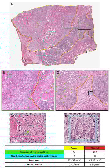 Nerve density is defined as the number of nerve profiles identified within a specific area and is expressed as the number per square millimeter or per high-power field (200× or 400×) [52]. Higher nerve density, in general, appears to correlate with worse prognosis. In most studies published thus far, at least one immunohistochemical marker has been used for identification of nerves [52]. While use of immunohistochemical markers increases the sensitivity for identifying nerves, individual immunostaining may not be widely available. Therefore, we propose a standardized method to accurately determine nerve density by hematoxylin and eosin (H&E) stains using scanned whole-slide images (WSI) (Figure 5). In the example illustrated here, a representative H&E-stained section including tumor as well as surrounding uninvolved tissue was scanned using a ScanScope digital pathology system (Aperio, Vista, CA, USA) in SVS format at a minimum magnification of 20× and visualized using ImageScope viewer (Aperio). All nerve profiles were annotated (green arrows) with specific notations for PNI (turquoise rectangles). The extent of viable tumor (yellow line), excluding nonviable tissue such as anucleate keratinous material (asterisks) and uninvolved tissue (red line), was drawn on the WSI. The respective tumor and normal areas were determined from the annotations, and the nerve density in each slide was calculated as the total number of nerves divided by area and expressed as the number per square millimeter.