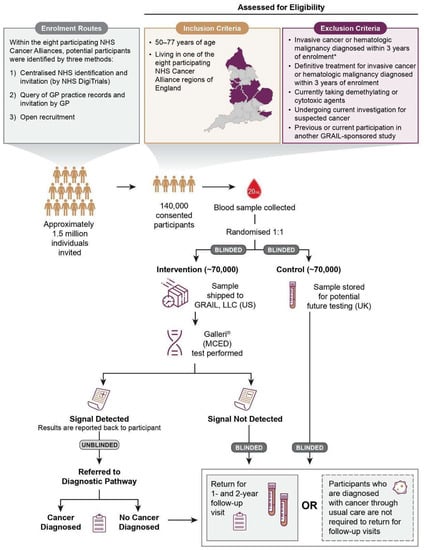 The NHS-Galleri trial (ISRCTN91431511), a randomised controlled trial, is the first of its kind. It aims to establish, in persons not undergoing current investigation for suspected cancer (asymptomatic individuals), whether the MCED test can reduce the incidence rate of late-stage cancer in the intervention arm compared to the control arm. The results of this trial conducted within the NHS in England will help inform the use of the MCED test for population screening in high-income countries. Further follow-up using centrally linked databases will allow us to study the impact of the test on cancer-specific mortality.