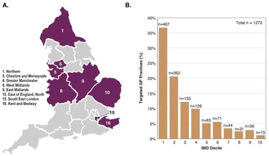 The trial aimed to enrol a representative sample of the population to ensure results are generalisable, to promote equity in healthcare and health research, and to minimise ‘healthy volunteer bias’ documented in prior screening studies [35,36]. We defined representativeness as including a reasonable absolute number of participants across sexes, neighbourhood-based socioeconomic groups, and major ethnic minority groups. We aimed to recruit at least 15,000 from each quintile of deprivation based on ranked neighbourhood groupings (Lower Layer Super Output Areas (LSOAs)s), at least 1500 from each major ethnic minority group (Black and Asian) and at least 12,000 in each five-year age group. We aimed to over-recruit older participants, in whom the burden of cancer is greatest. The eight participating Cancer Alliances (Figure 2A) were selected on the basis of a range of factors, including the level of socioeconomic deprivation and ethnic diversity, and relatively high cancer mortality and late-stage cancer diagnoses. Periodic characterisation and monitoring of the representativeness of enrolled participants compared to the general population aged 50–77 years was undertaken using participant-reported baseline data. Dynamic adjustment of invitation lists and targeted enrolment strategies were employed as needed. For example, we monitored the enrolment rates of participants from LSOAs by ranked deprivation index and dynamically adjusted invitation lists to target more participants from underrepresented groups [37]. Figure 2B shows the Index of Multiple Deprivation (IMD) score (1 = most deprived, 10 = least deprived) distribution of GP practices identified by NHS DigiTrials (from which eligible individuals registered at the GP practice were invited to attend), highlighting the targeted enrolment focus.