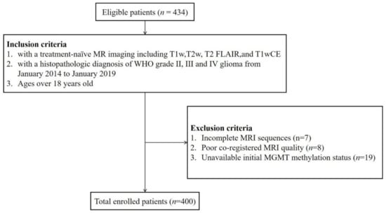 The Institutional Review Board of Seoul National University Hospital (SNUH) approved this retrospective study with a waiver of informed consent, and this study was carried out in accordance with the Declaration of Helsinki. From November 2014 to January 2019, 434 patients over 18 years old were consecutively and retrospectively enrolled in this study according to the following inclusion criteria: (1) histopathologic diagnostic confirmation of diffuse gliomas (i.e., WHO grade II-IV astrocytoma, oligodendroglioma, and glioblastoma) based on 2016 WHO CNS tumor classification at the initial operation; (2) treatment-naïve MRI, and (3) underwent standard treatment, including surgery or stereotactic biopsy. A total of 34 patients were excluded because of the following: (1) missing sequences (n = 7); (2) suboptimal image quality and consequent poor coregistration (n = 8), and (3) unavailable initial MGMT promoter methylation status (n = 19) (Figure 1). Finally, a total of 400 patients who underwent all four conventional MRI scans were enrolled in the study. Because the WHO classification system was changed in 2021, which was the time after the pathologic diagnosis was made, the pathologic diagnosis of the tumors was re-classified after enrollment. Detailed information regarding tissue diagnosis and genetic analysis is provided in the Supplementary Material.