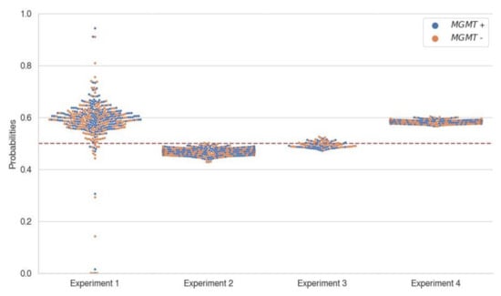 Probability score distribution according to the MGMT labels. The probability scores were predicted from the best model of each experiment (specified in Table 4) and obtained using the test set specific to each experiment. Note that there is no noticeable boundary in the distribution of data points between the groups with high and low probability scores, according to MGMT labels, which are indicated as different colors. MGMT+ (blue) indicates the methylated MGMT promotor group, and MGMT- (orange) indicates the unmethylated MGMT promotor group. The red dotted lines indicate chance level. Abbreviations: MGMT, O6-methylguanine-DNA methyltransferase.