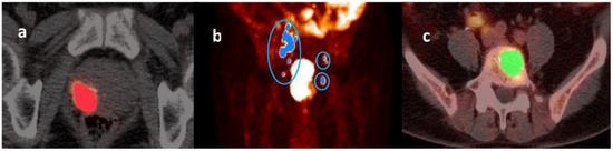 Region of interest (ROI)-based image segmentation was performed using the LIFEx software developed in Java [37]. A maximum standardized uptake value (SUV) threshold of 45% was used to delineate the primary prostate tumor and metastatic lymph nodes (Figure 1a,b) [38], whereas a fixed-absolute SUV threshold of 3.0 was applied for metastatic bone lesions (Figure 1c) [39].