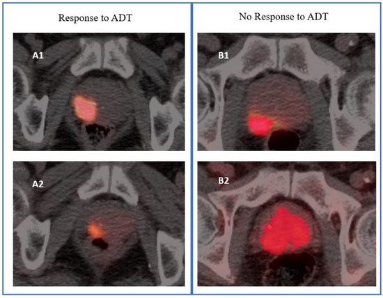 Illustrative images of response and no response to androgen deprivation therapy (ADT) of a primary prostate tumor based on metabolic tumor volume. The (A1,B1) PET/CT images were from 68Ga-PSMA-11 PET scans performed before the start of ADT (PET-1), whereas (A2,B2) were the corresponding images from 68Ga-PSMA-11 PET scans performed after 3 months of ADT (PET-2). Response was defined as a reduction ratio > 30% for PET-derived parameters measured on PET-2 versus PET-1.
