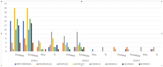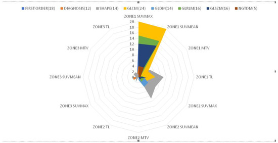 Distribution of features extracted from the three radiomic zones for distinguishing between responders and non-responders to androgen deprivation therapy (p < 0.05; independent Student’s t-tests or Mann–Whitney U test). Features were examined across the following eight categories: first-order statistics (18 features), diagnosis (12), shape (14), gray level co-occurrence matrix (glcm) (24), gray level dependence matrix (gldm) (14), gray level run length matrix (glrlm) (16), gray level size zone matrix (glszm) (16), and neighboring gray tone difference matrix (ngtdm) (5). Abbreviations: SUVmax, maximum standardized uptake value; SUVmean, mean of standardized uptake value; MTV, metabolic total volume; TL, total lesion.