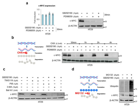 Since protein half-life is an important factor in protein homeostasis, and c-MYC mRNA and protein are both inherently unstable, with a half-life of about 30 min [31,32], we investigated c-MYC regulation in a short-term experiment. We treated HT29 cells with SB202190 and/or PD98059 for 30 min and found that at this short time point, p38α and ERK do not regulate c-MYC transcription but affect its protein levels. Indeed, we could not detect any changes in c-MYC mRNA expression after either single or combined inhibition (Figure 2a, left panel); instead, we observed a significant decrease in the c-MYC protein levels after inhibition of the p38α or the MEK pathway, and an even greater effect after a combined inhibition of both cascades (Figure 2a, right panel).