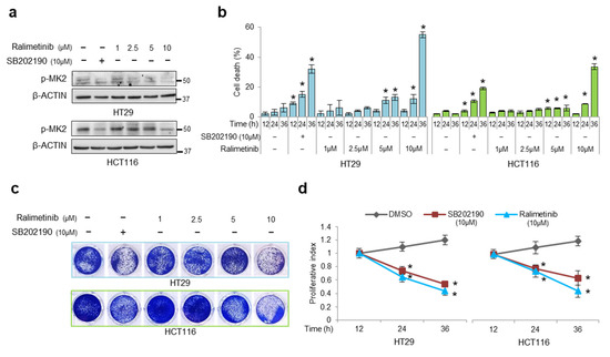 Treatment of CRC cells with ralimetinib or SB202190 decreases viability while increasing cell death. (a) Immunoblotting showing phosphorylated MK2 protein levels in HT29 and HCT116 cells treated with SB202190 (10 μM) or ralimetinib (1–10 μM) for 24 h. β-actin was used as a loading control. (b) Quantification of cell death by trypan blue staining in HT29 and HCT116 cells treated with SB202190 (10 μM) or ralimetinib (1–10 μM) for up to 36 h. (c) Cell viability assay on HT29 and HCT116 cells treated with ralimetinib (1–10 μM) or SB202190 (10 μM) for 36 h. (d) Proliferative index of HT29 and HCT116 cells treated with ralimetinib (10 μM) or SB202190 (10 μM) for up to 36 h, as determined by WST-1 assay. (b,d) Statistical analysis was performed using Student’s t-test; * p < 0.05 vs. untreated cells (b) or DMSO-treated cells (d). DMSO: dimethyl sulfoxide. The presented results are representative of at least three independent experiments. Detailed information about Western Blot can be found at supplementary materials.