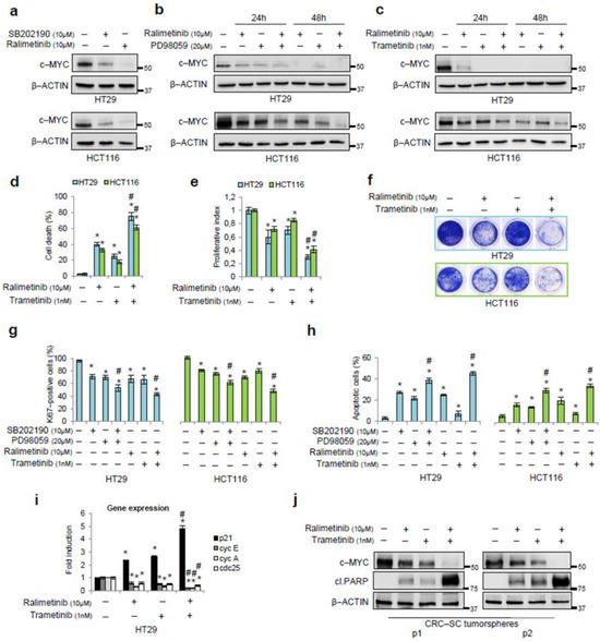Furthermore, given the major role of c-MYC as a transcription factor in CRC initiation and progression [10], we evaluated the expression of c-MYC target genes by real-time PCR upon p38α and MEK inhibition in HT29 cells. c-MYC inhibits the expression of p21 and activates the transcription of Cyclin E, Cyclin A, and cdc25, which are all involved in cell-cycle progression [43,44,45]. Treatments with ralimetinib and/or trametinib for 24 h increased the expression of p21 and reduced the levels of Cyclin E, Cyclin A, and cdc25 (Figure 4i). In order to improve the translational impact of our results, we evaluated the potential of the combined treatment with ralimetinib and trametinib in a CRC-stem cell (CRC-SC) tumorsphere model. Two lines of patient-derived CRC-SCs, grown as tumorspheres, were treated with ralimetinib and/or trametinib and subjected to immunoblot analysis. Our results revealed a decrease in c-MYC protein levels upon inhibition of p38α or MEK. This effect was even greater upon the combined inhibition of both kinases. Moreover, we detected the activation of the apoptotic pathway in CRC-SC tumorspheres treated with ralimetinib and/or trametinib, as shown by immunoblotting for cleaved PARP (Figure 4j). Again, a combined treatment with both inhibitors exhibited a higher pro-apoptotic activity compared to each single treatment alone (Figure 4j).
