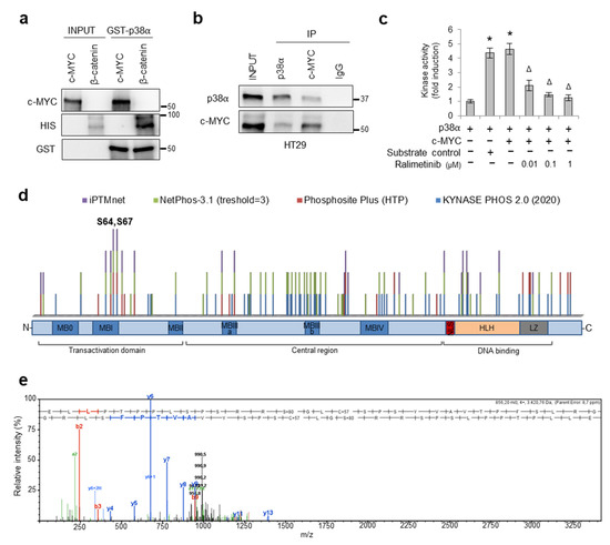 p38α interacts with and phosphorylates c-MYC. (a) In vitro binding assay between GST-p38α fusion protein and c-MYC recombinant protein. Bound proteins were analyzed by immunoblotting using anti-GST, anti-HIS, and anti-c-MYC antibodies. HIS-β-catenin was used as a positive control. (b) Co-immunoprecipitation of endogenous p38α and c-MYC in HT29 cells. (c) In vitro kinase assay showing c-MYC phosphorylation by p38α in the absence or presence of ralimetinib at the indicated concentrations. Statistical analysis was performed using Student’s t-test, * p < 0.05 vs. active p38α; ∆ p < 0.05 vs. active p38α + c-MYC. (d) In silico phosphorylation prediction meta-analysis. Four in silico prediction servers were used to identify MYC consensus phosphorylation sites: iPTMnet (https://research.bioinformatics.udel.edu/iptmnet; accessed on 14 April 2022), NETPHOS 3.1 (https://services.healthtech.dtu.dk/service.php?NetPhos-3.1; threshold ≥ 3, accessed on 14 April 2022), Phosphosite Plus (https://www.phosphosite.org/homeAction, only HTP data, accessed on 14 April 2022), and KynasePhos 2.0 (http://kinasephos2.mbc.nctu.edu.tw/, accessed on 13 December 2020). (e) MS/MS spectrum of the double-charged precursor ion of E54LLPTPPLSPSRRSGLCSPSYVAVTPFSLRG84. MB: MYC Boxed conserved domain. NLS: nuclear localization sequence. HLH: helix–loop–helix domain. LZ: leucine zip domain. The presented results are representative of at least three independent experiments. Detailed information about Western Blot can be found at supplementary materials.