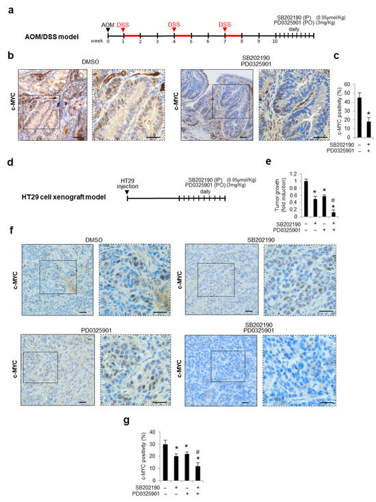 Combined inhibition of p38a and MEK affects c-MYC protein stability in preclinical mouse models. (a) Treatment scheme of AOM/DSS mice. (b,c) Immunohistochemistry analysis (b) and quantification (c) of c-MYC protein expression in colon tissue sections from AOM/DSS mice treated with DMSO or with SB202190 and PD0325901. (d) Treatment scheme of HT29-cell-xenograft mice. (e) Quantification of the volume of tumors explanted from HT29-xenografted mice treated with DMSO or with SB202190 and/or PD0325901. (f) Immunohistochemistry analysis of c-MYC protein expression in colon tissue sections from HT29-xenografted mice treated as above. (g) Quantification of c-MYC protein expression in colon tissue sections from HT29-xenografted mice treated as above. Magnification: 20×–40×. DMSO: dimethyl sulfoxide. Scale bar: 50 μm. IP: intraperitoneal injection. PO: oral administration. Statistical analysis was performed using Student’s t-test; * p < 0.05: vs. untreated cells, # p < 0.05: vs. corresponding single treatment. The presented results are representative of at least three independent experiments.