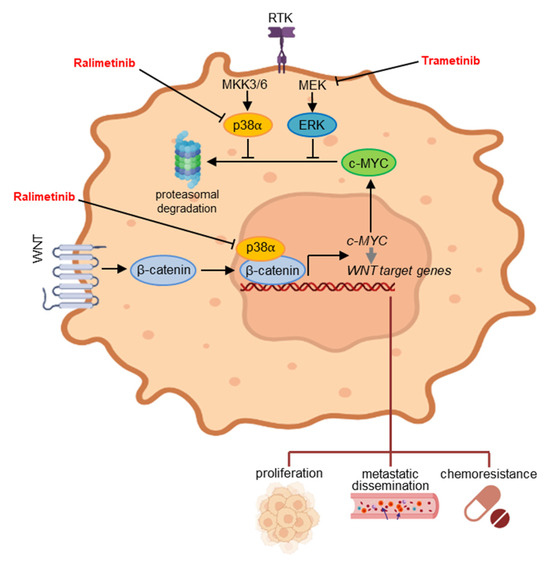 c-MYC is one of the most important factors in CRC and is maintained upregulated through β-catenin-mediated transcriptional activation and ERK-mediated post-translational stabilization. Our previous and current findings indicate that p38α, a kinase involved in CRC metabolism and survival, contributes to both mechanisms. As a result, the p38α inhibitor ralimetinib may prove effective in impairing cellular proliferation, reducing metastatic dissemination and overcoming chemoresistance in CRC.
