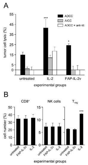 The use of alternative immune-stimulating agents that do not preferentially induce immune-inhibiting cells may provide an alternative. One promising molecule in this context is the mutated variant of IL-2 (IL-2v), with reduced binding to the IL-2RA subunit of the high-affinity trimeric IL-2 receptor (IL-2RABG; A, B and G for α (CD25), β (CD122) and γ receptor chain (CD132)) [6] expressed by Treg but with efficient binding to the intermediate-affinity dimeric IL-2RBG [6] expressed by NK and resting T cells. Recently, the proliferation of NK cells and effective activation of cytotoxic T cells without preferential activation of Treg has been shown in vitro after incubation of peripheral blood mononuclear cells with IL-2v conjugated with an Ab against the fibroblast activation protein α (FAP) [7]. Due to abolished Fcγ receptor binding (P329G LALA mutations), FAP-IL-2v does not induce ADCC against FAP-positive cells and serves as a vehicle for IL-2v, transporting it into the tumor microenvironment. Importantly, the activating effects of FAP-IL-2v on effector cells by IL-2v has been shown to be translated into the considerably enhanced antitumor activity of these effector cells against tumor cells mediated by the therapeutic Ab [7], thus clearly showing advantageous therapeutic effects compared to the non-modified IL-2.