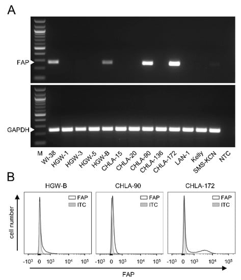 Analysis of FAP expression by human NB cells. (A) Representative images of the RT-PCR analysis of FAP mRNA levels (PCR product size: 268 bp) in NB cells derived from tumors of high-risk NB patients (HGW-1, HGW-3, HGW-5, HGW-B) and well-known NB cell lines (CHLA-15, CHLA-20, CHLA-90, CHLA-136, CHLA-172, LAN-1, Kelly, SMS-KCN). Human fibroblasts WI-38 were used as a positive and GAPDH (PCR product size: 238 bp) as an internal control. M: marker, NTC: no template control. (B) Representative histograms of the flow cytometry analysis of FAP abundance in human NB cells (HGW-B, CHLA-90, CHLA-172). Cells were stained with anti-human FAP-PE Ab (black curve) or appropriate ITC (grey-filled curve). Full gel images can be found at Supplementary Materials.