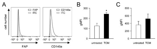As expected, PAMF showed a clear signal for CD140a (Figure 3A). Similarly, flow cytometry analysis revealed a basal level of FAP (Figure 3A), thus confirming the suitability of both markers for fibroblast detection. Importantly, incubation of PAMF with tumor-conditioned medium (TCM) for 48 h resulted in a significant, approximately two-fold increase in FAP expression compared to the untreated control (Figure 3B). Interestingly, a TCM-dependent increase in CD140a was also observed (Figure 3C); however, the difference was not statistically significant.
