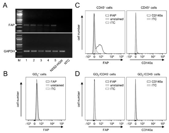 Analysis of FAP and CD140a expression in murine tumor tissue. (A) Representative images of the RT-PCR analysis of FAP mRNA levels (PCR product size: 268 bp) in five tumor tissue samples (1–5) and by the murine tumor cells NXS2-HGW that were used for tumor cell implantation. GAPDH (PCR product size: 238 bp) served as an internal control. M: marker, NTC: no template control. (B) A representative histogram of the flow cytometry analysis of FAP and CD140a abundance in the GD2- and CD45 double-negative cells within primary tumor tissue. Samples were collected when tumors reached a size of 750 mm3, followed by enzymatic digestion to obtain a single-cell solution. Samples were then stained with rabbit anti-mouse anti-FAP IgG and PE-labeled anti-rabbit IgG Ab, which served as primary and secondary Ab and FITC-labeled anti-mouse CD140a Ab, respectively (black curve), or appropriate ITC (black dashed curve). Unstained cells served as negative control (unstained; grey-filled curve). (C) A representative histogram of the flow cytometry analysis of FAP and CD140a abundance in the CD45-positive cells detected in tumor tissue. (D) A representative histogram of the flow cytometry analysis of FAP levels in NXS2-HGW cells that served for induction of primary tumors. Full gel images can be found at Supplementary Materials.