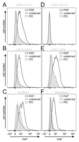 To further characterize the FAP-positive CD11b cell fraction, we included additional cell markers to determine the immune-suppressive cells of the myeloid lineage MDSC, namely monocytic (M)- (CD11b+/Ly6Chigh/Ly6G−) and polymorphonuclear (PMN)-MDSC CD11b+/Ly6Clow/Ly6G+). Interestingly, both MDSC populations (Figure 5C,F) and the CD11b+ cells that did not express Ly6C and Ly6G showed a clear FAP signal (Figure 5B,E).