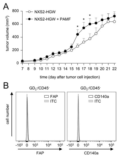Impact of PAMF on tumor growth. (A) Analysis of tumor growth in mice injected with either NXS2-HGW (open circles) or NXS2-HGW in combination with PAMF (closed circles). Tumors were surgically resected on day 22 after tumor cell injection. Co-injection was performed at the tumor-cell-to-PAMF ratio of 2:1. When mice were sacrificed ahead of schedule due to tumor burden, the last measurement was included into the calculation of tumor growth at subsequent time points. Data are given as mean + SEM. * p < 0.05, t-test (B) Representative histograms of flow cytometry analysis of FAP and CD140a levels in tumor tissue of mice injected with NXS2-HGW in combination with PAMF. To detect CAFs (FAP+/CD140a+), leukocytes and tumor cells were excluded from the analysis using CD45 and GD2 expression, respectively.