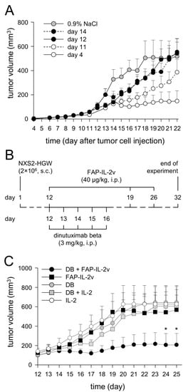 Since the immunotherapy with DB (i.p., five consecutive days, 3 mg/kg bw/day, start of treatment: four days after tumor cell implantation) showed, in our syngeneic tumor model, strong antitumor efficacy against NB, resulting in constant tumor regression [12,14], we aimed to establish a more resistant version of this tumor model allowing the evaluation of the combinatorial immunotherapy with DB and FAP-IL-2v. For this, we started DB treatments in a later tumor growth phase (day 11, 12 and 14), after the development of measurable tumors.