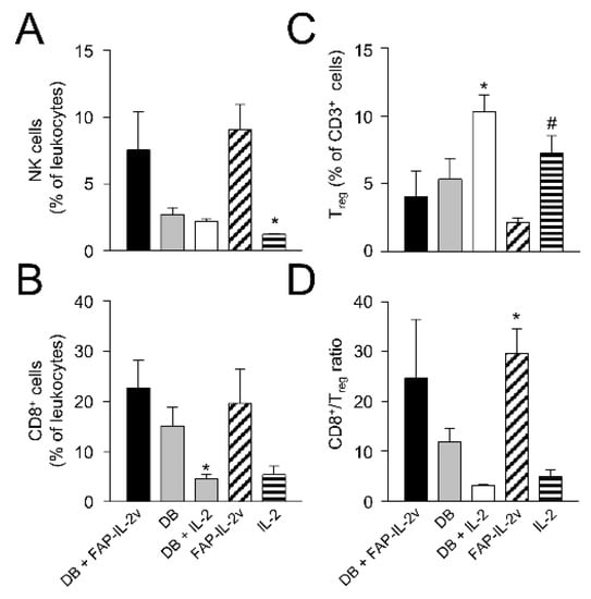 Flow cytometry analysis of tumor-infiltrating lymphocytes. To investigate effects of the combinatorial DB + FAP-IL-2v treatment on tumor-infiltrating lymphocytes, primary tumor tissue was analyzed using flow cytometry. After resection, primary tumor tissue samples were enzymatically digested to obtain a single-cell solution. To assess NK (A) and cytotoxic T cells (B) as well as Treg (C), the effector-cell-population-specific antigens CD335 and CD8 as well as CD25 and FocP3 were marked, respectively. Additionally, the ratio of cytotoxic T cells to Treg (D) was calculated. Results are presented as a percentage of the respective effector cell population cells relative to all viable CD45- or CD3-positive leukocytes for NK and cytotoxic T cells or Treg, respectively. ANOVA followed by appropriate post-hoc comparison test and t-test. (A) * p < 0.05 vs. FAP-IL-2v, (B) * p < 0.05 vs. DB + FAP-IL-2v, (C) * p < 0.05 vs. DB + FAP-IL-2v, # p < 0.05 vs. FAP-IL-2v, (D) * p < 0.05 vs. IL-2.