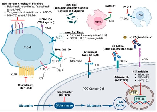 The treatment landscape for ccRCC has evolved tremendously with the advent of immune checkpoint inhibitors (ICIs). The current standard first-line treatment for advanced ccRCC includes an immuno-oncology (IO) combination. The dual immune checkpoint blockade of ipilimumab plus nivolumab targeting cytotoxic T-lymphocytes-associated protein 4 (CTLA-4) and programmed-cell death protein 1 (PD-1), respectively, was the first and the only IO/IO combination approved by the Food and Drug Administration (FDA) based on the CheckMate 214 [1]. The other IO combination strategy involves an ICI targeting anti-PD-1 or its ligand (anti-PD-L1) plus an anti-VEGF tyrosine kinase inhibitor (TKI). There are four FDA approved combinations that belong to the IO/TKI category: pembrolizumab/axitinib [2] (KEYNOTE 426), avelumab/axitinib [3] (JAVELIN Renal 101), nivolumab/cabozantinib [4] (CheckMate 9ER), and pembrolizumab/lenvatinib [5] (CLEAR). The IO combinations brought improved overall survival benefits and unprecedented durable response in metastatic ccRCC. However, a significant subset of patients still has primary resistance to IO combinations or develop acquired resistance and eventually succumb to their disease. Therefore, there is an unmet need to develop new treatment options to improve the outcomes in ccRCC. This review will discuss how an understanding of ccRCC biology shapes current drug development in this disease and introduce emerging novel therapeutic agents that are currently under investigation.