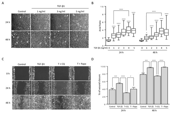 TGF-1 changed cell morphology from epithelial to mesenchymal-like cells and increased cell migration ability. (A) Morphological changes of A549 cells under TGF-1 treatment. A549 lung cancer cells were treated with the indicated concentration of TGF-1 for 24 h and 48 h. Bar, 100 m. (B) Box plots for the axial ratio (AR) of A549 cells under TGF- treatment in a dose-dependent manner. The cell images were transformed to remove the background using ImageJ software. At least 200 cells randomly selected from 20 independent areas were used to determine the AR ratio of straight cells. Data represent the median values with interquartile range in at least three independent experiments. **** p < 0.0001 compared to controls were determined by two-way ANOVA followed by Tukey’s test. (C) The wound-healing assay. A549 cells were incubated with TGF-1 4 ng/mL in the presence or absence of 20 M chloroquine or 100 nM rapamycin for 24 h and 48 h. Bar, 250 m. The wound edge at 0 h is indicated by white (dotted) lines. (D) Quantification of the percentage of wound closure relative to the original wound area. Data indicate the mean values ± s.d of at least three independent experiments. * p < 0.05, *** p < 0.001, **** p < 0.0001 compared to controls were determined by two-way ANOVA followed by Tukey’s test.