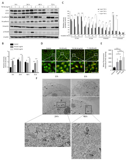 The activation of autophagy is involved in TGF-1-induced EMT. (A) Western blotting. A549 cells were treated with the indicated concentrations of TGF-1 (0–4 ng/mL) for 8 h, 24 h, 48 h, and 72 h. EMT markers (E-cadherin, N-cadherin, Vimentin, phosphorylated Smad3 (Ser423/425)) and LC3 proteins were detected using their primary antibodies. -actin was used as a loading control. (B) Relative intensity of LC3-II. The relative LC3-II values to LC3-I were quantified using ImageJ software and normalized by -actin. Data indicate the mean values ± s.d of at least three independent experiments. (C) Relative intensity of other EMT markers. The relative values for each EMT marker protein (E-cadherin, N-cadherin, Vimentin, phosphorylated Smad3 (Ser423/425)) were normalized by -actin. (D) AO staining assay. Acridine orange dye stained acidic vehicles of A594 cells incubated with indicated treatments: TGF-1 4 ng/mL, 20 M Chloroquine. The bottom images were magnified from the dotted rectangle area. (E) The mean fluorescence intensity of AO staining was quantified from at least three independent experiments using the ImageJ program. Scale bar in upper and bottom, 50 m. (F) Transmission electron microscopy (TEM) of A549 cell in treatment with 4 ng/mL of TGF-1 for 0, 8, 24, 48 h. Autophagosomes and autolysosomes are indicated with black arrows. The bottom images were magnified from a specific area. * p < 0.05, ** p < 0.01, *** p < 0.00, **** p < 0.001 compared to control.