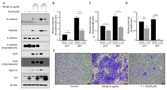 Inhibition of autophagy down-regulates mesenchymal protein expression and invasion ability. (A) Western blotting. Protein expression of EMT and autophagy markers in A549 were detected after treatment with TGF-1 4 ng/mL or 20 M chloroquine for 24 h and 48 h. (B–D) Graph representing the relative intensity of N-cadherin and Vimentin, SNAI1 normalized by -actin. Data represent the mean ± s.d of three independent experiments. **** p < 0.0001; ** p < 0.01; * p < 0.05 p-value were evaluated by two-way ANOVA followed by Tukey’s test. (E) Invasion assay. A549 cells were placed in the upper chamber of the basement membrane layer under TGF-1 or TGF-1 with chloroquine treatment for 24 h. A549 cells that passed the basement membrane at the bottom of the insert chamber were captured by bright-field microscopy. Bar, 100 M.