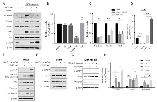 To demonstrate how autophagy regulates mesenchymal protein expression, we disturbed the autophagy activity through CQ or knockdown BECN1 (Figure 4A). We transfected A549 cells with shBECN1, and its effect was confirmed by reducing the BECN1 protein level at about 74% in comparison to control cells (Figure 4B). Then, the cells were further treated with TGF-1 4 ng/mL with or without 20 M CQ for 24 h. We found that N-cadherin, Vimentin, and SNAI1 expressions induced by TGF-1 treatment were considerably supressed upon inhibition of autophagy with CQ or BECN1-knockdown (Figure 4C). We further examined expression of EMT-related proteins in additional cancer cell lines, including MDA-MB-231 (breast), DU145 (prostate), and H1299 (lung) cells treated with 10 ng/mL TGF-1. Both H1299 and MDA-MB-231 cells exhibited a similar expression of Vimentin upon treatment of TGF-1 but a decreased expression in the co-treatment of CQ with TGF-1 (Figure 4E,G) as shown in A549 cells. However, Vimentin expression in DU145 cells, was not significantly affected by either TGF-1 or co-treatment of TGF-1 with CQ (Figure 4F), indicating that each cancer cell might differently respond to TGF-1. Interestingly, inhibition of autophagy under treatment with TGF-1 in A549 cells exhibited a significantly increased phosphorylation of eukaryotic elongation factor 2 (eEF2) at threonine 56 (T56) (Figure 4A). Indeed, phosphorylation of eEF2 (T56) decreases elongation rate during protein synthesis, which plays an essential role to control the translational step [41]. In particular, decreased eEF2 phosphorylation (T56) in TGF-1-treated A549 cells was significantly elevated in autophagy-deficient A549 cells by either CQ or BECN1 knockdown (Figure 4D). This eEF2 phosphorylation (T56) was similarly observed in TGF-1-treated other cancer cells upon inhibition of the autophagy process by CQ treatment (Figure 4E–H). However, in these cancer cells, the relative levels of p-EF2 at T56 responding to TGF-1 was different from one shown in A549 cells because they were less sensitive to TGF-1. we used 10 ng/ml concentration of TGF-1 rather than 4 ng/mL in A549 cells (Figure 4E–G). These results suggested that inhibition of autophagy could supress protein synthesis in cancer cells during the TGF-1-induced EMT process.