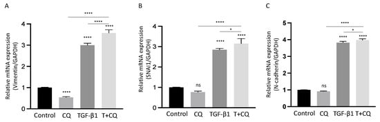 In addition to these results, we examined altered mRNA levels in response to TGF-1 with or without CQ at 24 h (Figure 5). Interestingly, mRNAs of mesenchymal gene and protein levels were in opposite directions. As shown above, CQ treatment with TGF-1 decreased mesenchymal protein levels significantly. However, the mRNA levels were similar between TGF-1 and TGF-1 with CQ. In addition, Vimentin mRNA showed a higher mRNA level with co-treatment of CQ and TGF-1 compared with other conditions. These results indicate that, despite autophagy inhibition, TGF-1 successfully promotes mRNAs transcription, and inhibiting autophagy may modulate EMT through translational regulation of intracellular EMT proteins.