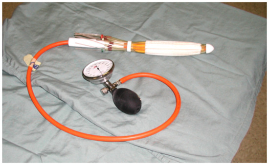 Patients were treated with preoperative high-dose-rate brachytherapy using the Novi Sad [13] endorectal applicator (Nucletron Corp., Columbia, MD, USA), with 8 catheters arranged around its circumference. The applicator (Figure 1) contained a balloon, which could be inflated so as to immobilize the device in the desired position in the rectum. Once the endorectal applicator was placed along the radio-opaque clips, patients underwent immediate CT simulation. The applicator catheters and the tumor contours were produced, and then projected onto digitally reconstructed radiographs (DRRs). In order to enhance the visualization of the bony landmarks, applicator, and clips, we used digitally composited radiographs (DCRs) and 3D renderings. For treatment planning, only dwell positions in catheters proximal to the tumor were selected. This source-positioning technique [13] allowed treatment of semi-circumferential lesions in a conformal manner. Following the source positioning, CT-based brachytherapy treatment planning was carried out to optimize the dose to the tumor. Dose distribution calculations were done using the in-house McGill Planning System (MPS), based on the AAPM TG-43 protocol [14]. Dose distributions were generated for a sequence of planes in arbitrary orientations and then superimposed onto two orthogonal DRRs.